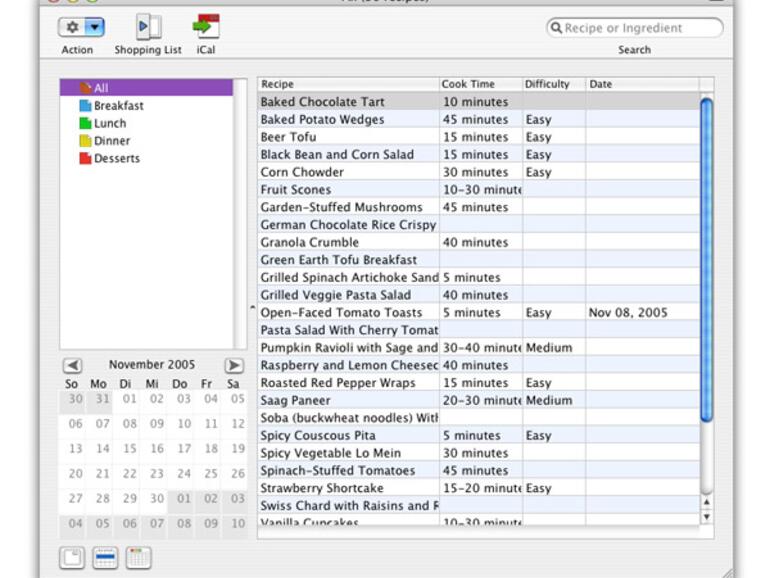 Der Kalender ist eine gute Idee, denn so lassen sich Mahlzeiten bequem im voraus planen. Optisch und bei der Importfunktion hat jedoch MacGourmet den Löffel vorn – allerdings ist der Organized Gourmet auch um knapp 15 US-Dollar günstiger als die Shareware des Monats aus Heft 11/2005.