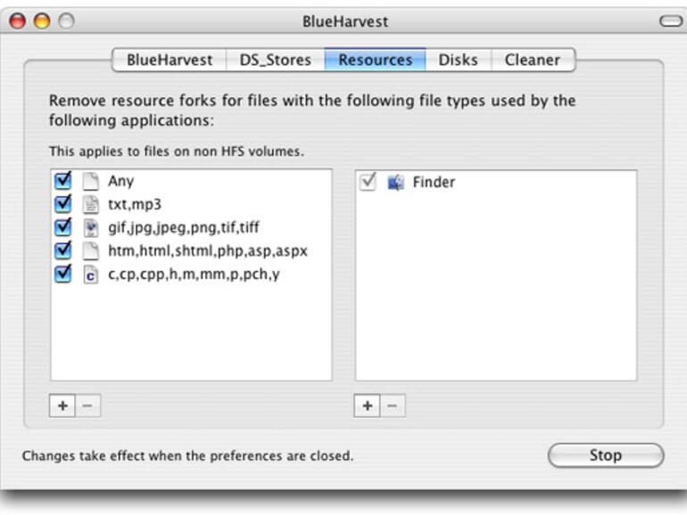 Ganz schön dämlich, meinen Windows-Benutzer oder Anwender diverser Geräte, die nicht von Apple stammen. In den Dateien werden beispielsweise Finder-Einstellungen gesichert – für den reinen Datenaustausch völlig unnötig. Einige Endgeräte reagieren auf die Dateiflut gar irritiert. Das Ergebnis sind viele Hilfsanwendungen, welche das Auswerfen der Wechselmedien übernehmen und dabei gleich die unnötigen Dateien löschen. Blue Harvest gehört zu den umfangreicheren Programmen, die den DS_STORE- und Resourcefork-Dateien den Kampf angesagt haben. Letztere sind hauptverantwortlich für die Dateivermehrung und können in BlueHarvest auf bestimmte Dateitypen beschränkt werden.