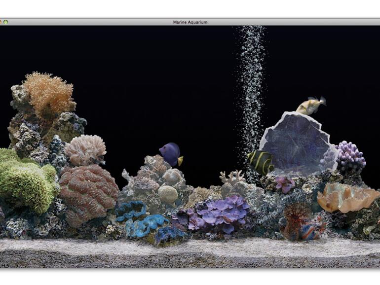 Einmal ins Aquarium gesetzt, ziehen die Fische ihre Bahnen, und das sieht durchaus realistisch aus. Weniger für die Fische, sondern mehr für den Menschen vor dem Display interessant ist die optionale Integration einer Zeit- und Datumsanzeige. Realistisch blubbern Sauerstoffblasen aus dem Boden und durch die Simulation der Beleuchtung lässt sich auch die Wasserbewegungen gut erkennen. Optional ist ein Tag-/Nachtwechsel im Zeitraffer: Nach ein paar Minuten schwimmen die Fische im Dunkeln, die Gefahr, wüste Beschimpfungen aus dem Aquarium zu hören, ist aber wie in der Realität äußerst gering.