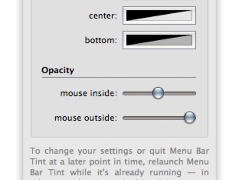 Ähnliche Reaktionen löste die transparente Menüleiste in Leopard aus, auch dafür wurde ein Schalter angeboten. Menu Bar Tint geht deutlich weiter: Es erlaubt die Färbung der Menüzeile. Dazu müssen nur drei Farben definiert werden, aus denen der Farbübergang erstellt wird. Mit den Deckkraft-Reglern wird festgelegt, wie deutlich der Farbverlauf zu sehen sein soll, wenn sich der Mauszeiger außerhalb oder innerhalb der Menüzeile befindet. Änderungen lassen sich leicht rückgängig machen, indem Menu Bar Tint mit einem Klick auf Quit beendet wird.