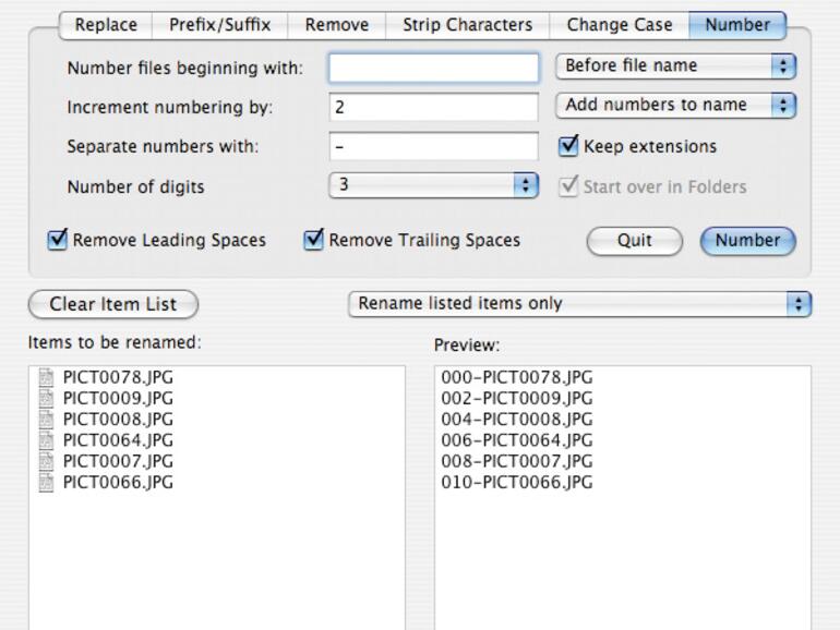 „Prefix/Suffix“ fügt einen Text vor und/oder nach dem Dateinamen ein, „Change Case“ ändert die Groß-/Kleinschreibung von Dateinamen und -endung, und „Number“ nummeriert die Dateien durch – anders als bei der Konkurrenz, aber nur durch Hinzufügen von Zahlen.