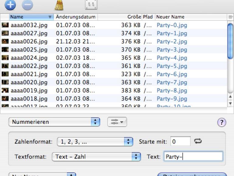 Gleich zwei Programme machen das Umbenennen zum Kinderspiel: R-Name und Renamer4Mac. Letzteres ist vor Kurzem aktualisiert worden: Frische Namen, jetzt auch für Intel-Macs. Die gewünschten Dateien werden auf das Hauptfenster gezogen. Diese Dateien dürfen auch in unterschiedlichen Ordnern liegen, nur die Ordner selber sollten nicht auf das Fenster gezogen werden.