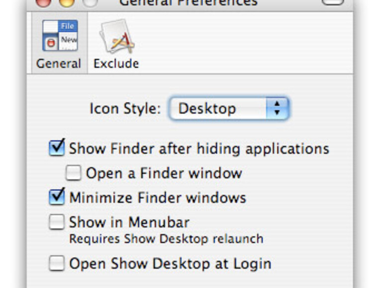 Da sich mit steigender Bildschirmgröße auf wundersame Weise auch die Fenster vermehren, gibt es Softwarewege, um den Überblick zu behalten. Was den Bodensatz auf dem Mac-Bildschirm bildet, bringt Show Desktop hervor. Das Programm ist eine etwas flexiblere Version der „Andere ausblenden“-Funktion von OS X. Nach dem Start residiert es im Dock, per Mausklick werden alle Programme ausgeblendet. Der Finder kann davon ausgenommen werden, außerdem gibt es eine Ausschlussliste, in der all die Programme Platz finden, die nicht beim Versteckspiel mitmachen sollen. Neben der Positionierung im Dock kann Show Desktop auch in der Menüzeile erscheinen.