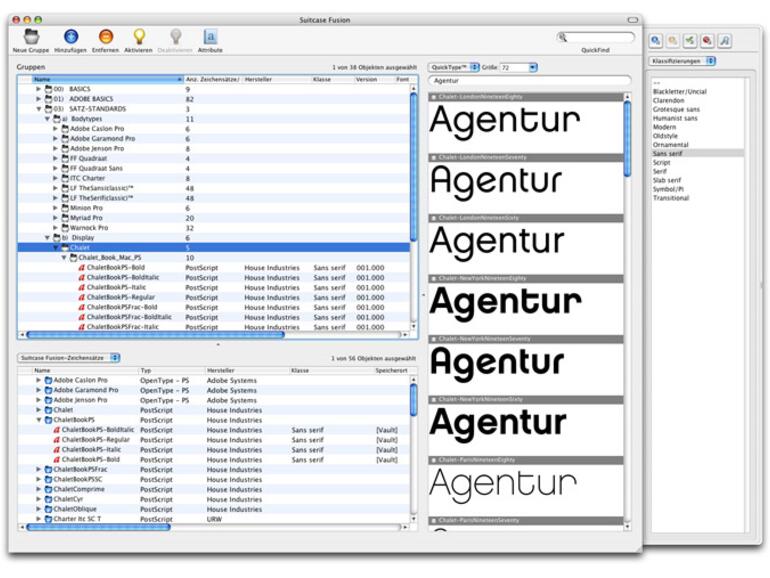 Sie zeigt sich in den neu hinzugekommenen Infoanzeige-Punkten in den beiden Hauptfeldern Gruppen und Zeichensätze: Neben Informationen zum Schrifttyp (Klasse), zur Konturgröße, zur Version, zum Schriftkerning und zum Ablageort des Fonts wird auch die vergebene Font-Sense-Nummer aufgelistet, welche in Suitcase Fusion zur Identifikation des jeweiligen Fonts dient. Eine wichtige Rolle spielt sie vor allem beim Auffinden von Font-Dubletten – z. B. einer Times von unterschiedlichen Herstellern. Die erweiterten Indizierungspunkte ermöglichen nicht nur ein Ausschalten von dublettenbedingten Font-Konflikten, tiefergehende Listeninfos und sonstige Informationsanzeigen machen auch das Nachvollziehen von Konfliktsituationen einfacher.