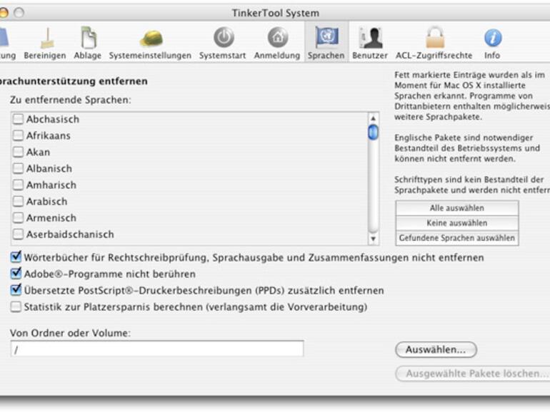 Während Monolingual es jedoch dem Anwender überlässt, entsprechende Sicherheitsvorkehrungen zu treffen und diese oder jene Verzeichnisse auszulassen, geht TinkerTool System einen Schritt weiter und bietet schon im Vorfeld Optionen zur Vermeidung größerer Ärgernisse. So müssen einfach nur die jeweiligen Kästchen markiert werden, damit es später kein böses Erwachen gibt, Adobe-Anwendungen sich laufend selbst reparieren wollen oder aber Wörterbücher im Datennirwana enden. TinkerTool System ist aber weit mehr, nämlich wesentliche Anlaufstelle für alle Arten von Pflegefällen. Das kann ein Problem im Schriftcache sein, so dass beispielsweise bestimmte Widgets überhaupt nicht mehr so aussehen wie erwartet, das kann aber auch eine plötzlich nicht mehr funktionierende Onlinehilfe sein, die einfach nur noch leere Seiten anzeigt oder deren Verweise nicht mehr funktionieren. Eine ausführliche Liste des Angebots lässt sich auf der Website des Herstellers einsehen.
