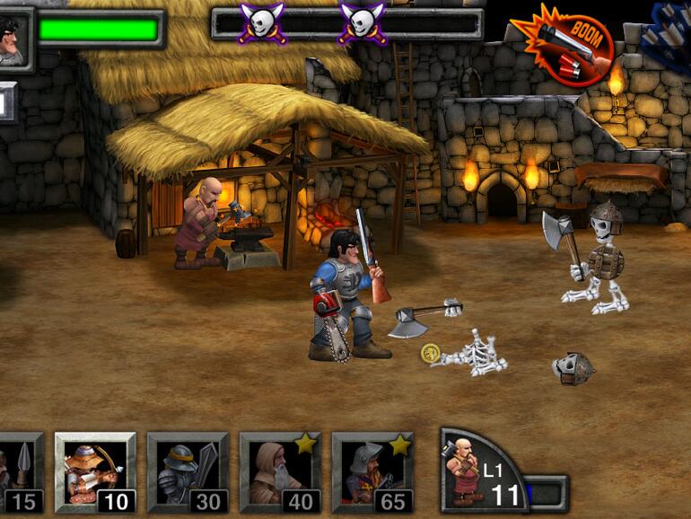 Die Armee muss aufgehalten werden und darf nicht zur Burg und dem dort versteckten Buch – dem Necronomicon – vordringen. Ash kann durch das Töten von Gegnern Metallstücke für den Schmied einsammeln. Dieser fertigt ab einer bestimmten Anzahl dieses Rohmaterials zusätzliche Krieger an, die Sie selbst auswählen dürfen. Nach jedem Level lassen sich mit dem verdienten Geld Kampfgefährten, mehr Feuerkraft und Gesundheit für Ash sowie verschiedene Waffen einkaufen. Zwar wechselt der Schauplatz des Games innerhalb der 50 Level nicht einmal, dem Spielspaß tut dies jedoch kaum Abbruch. Das Game fesselt durch einen langsam ansteigenden Schwierigkeitsgrad und bietet durch die unterschiedlichen Gegner und Kampfgefährten Abwechslung. In jedem Level gilt es erneut, die richtige Taktik zu finden.