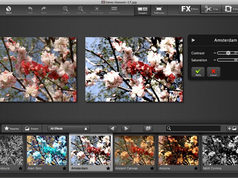 Offenbar ist die App aber während der Portierung ein paar Mal um den Block gelaufen, denn diese Version bietet weniger Effekte für einen höheren Preis, selbst inklusive aller In-App-Käufe. Für den Mac gibt es auch eine Pro-Version für 32 Euro, doch über die Unterschiede zwischen Standard- und Pro-Version schweigt sich der Hersteller aus, die Beschreibung ist identisch. Zwar kann die App auch Bilder freistellen und drehen, aber der Schwerpunkt liegt klar auf den Effekten, die unten auf dem Screen mit ihren Vorschaubildern angeordnet sind. Bei so einer Masse an Effekten ist es mühsam, sich durch die ganze Liste zu arbeiten. Einfacher wird es, wenn die besten Filter als Favoriten markiert werden. Auf jedes Foto können mehrere angewendet werden – so eine Filterkette wird optional als Vorlage gesichert. Der Hauptvorteil der Mac-Version ist die Fähigkeit, größere Fotos zu bearbeiten. Dafür zahlen Mac-Anwender allerdings drauf – und das bei deutlich weniger Effekten.