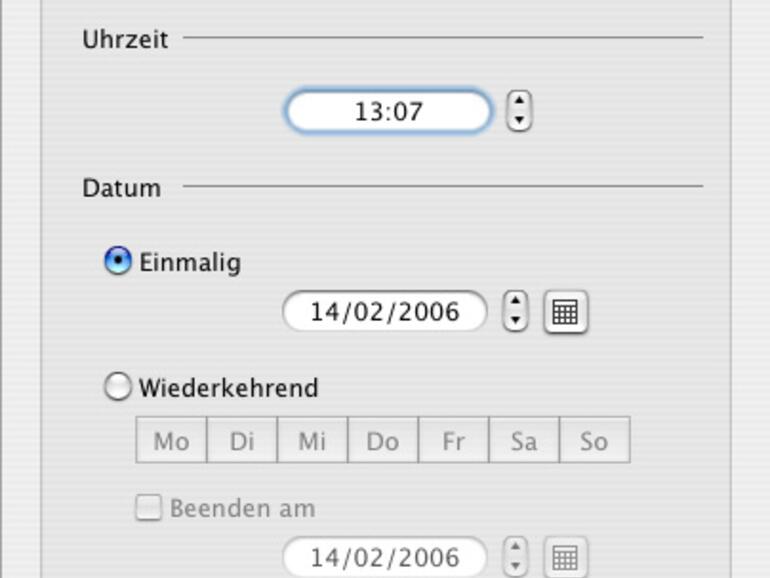 Zunächst wird die Zeit angegeben und danach festgelegt, ob es sich um einen einmaligen oder wiederkehrenden Alarm handelt. In letzterem Falle kann der Alarm auf einzelne Wochentage beschränkt werden, falls der Mac zum Beispiel am Wochenende nicht um 5:15 Uhr Alarm schlagen soll. Geweckt wird mit einem Song aus dem Repertoire der iTunes-Mediathek. Es wäre aber sicherlich effektiver, wenn Alarm Clock noch eine Auswahl echter Alarmtöne bieten würde. Alarm Clock unterstützt die Apple- Fernbedienung und kann den Mac nach einmaliger Autorisierung auch aus dem Ruhezustand aufwecken.