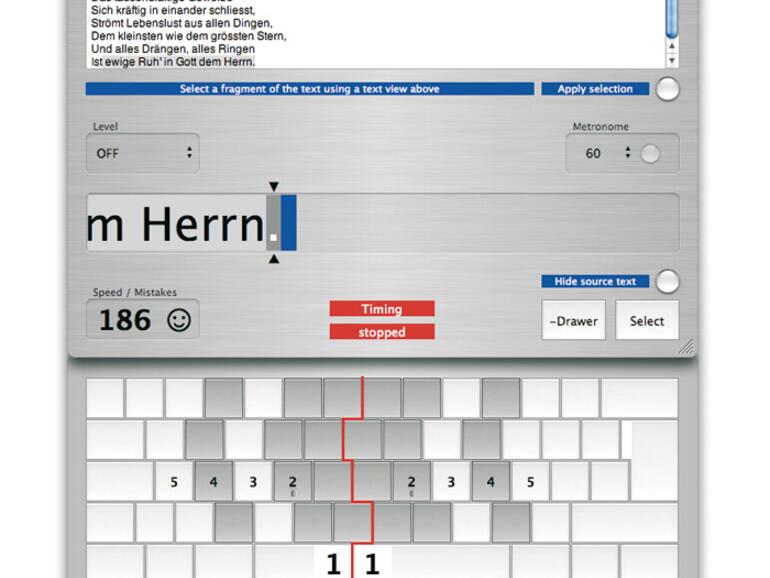 Einige Beispieltexte liegen im Programmpaket, es verarbeitet aber auch jede RTF-Datei. Die Tastenanordnung passt sich dem des Systems an, und ein Metronom gibt den Rhythmus vor. Wird ein Zufallstext gewählt, gibt es verschiedene Level, die sich durch die Anzahl der unterschiedlichen Buchstaben und Sonderzeichen unterscheiden. Zahlen auf der virtuellen Tastatur unterhalb des Hauptfensters zeigen an, auf welchen Tasten die Finger liegen sollten. Das Programm bietet zwar eine Art Bewertung in Form der Geschwindigkeitsmessung, aber keine Statistik.