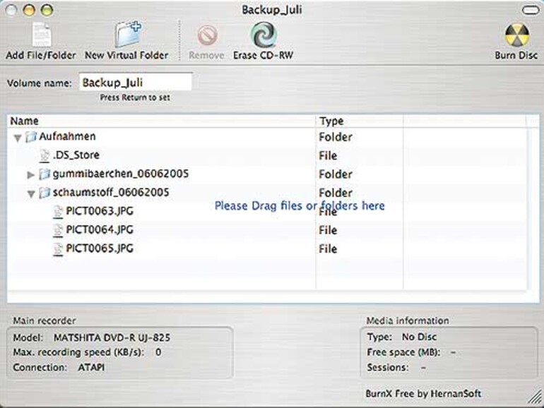 BurnX Free bringt das tigerhafte Brenn-Feeling in Mac OS X Versionen ab 10.2.3. Die Applikation bedient sich der Liste aller ausgewählten Dateien und belässt die Originale an ihrem ursprünglichen Platz. Die Freeware brennt z. Zt. ausschließlich CDs und unterstützt wieder beschreibbare Rohlinge. Ein Löschschalter vereinfacht das vollständige Entleeren der Medien. Als Hardware werden von Apple unterstützte CD- bzw. DVD-Brenner vorausgesetzt. Der gebrannte Datenträger wird problemlos von Windows-Systemen gelesen. Wenn Sie eine so genannte Multi-Session-CD anlegen, lesen Windows-PCs nur die erste Sitzung. Das Manko ist allerdings nicht BurnX Free anzulasten.