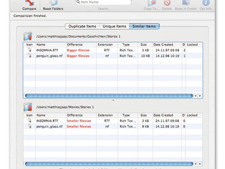 Ein Dateivergleich, der den Inhalt nicht analysiert, überlässt es letztlich dem Benutzer, nach Unterschieden zu suchen. Den groben Vergleich von Dateien im Finder-Fenster erleichtert es jedoch sehr.