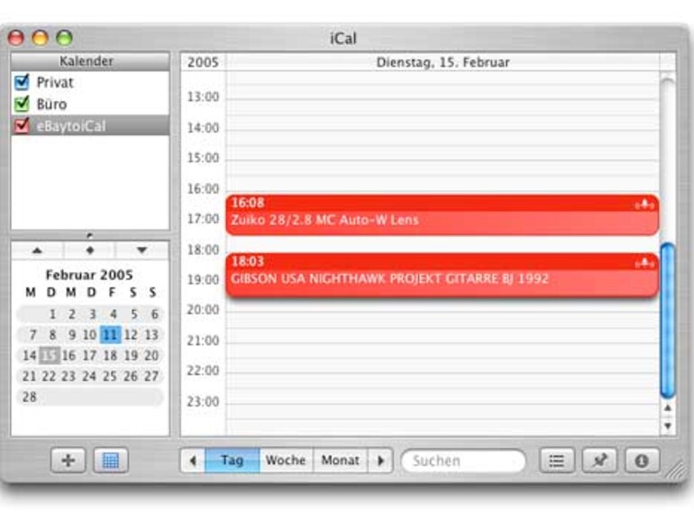 Bei der Freeware handelt es sich um ein Applescript, welches Auktionen in den Mac-OS-X-Kalender iCal einträgt. Dazu legt das Skript einen eigenen Kalender innerhalb von iCal an. Dieser trägt den Namen eBaytoiCal und beinhaltet im weiteren Gebrauch alle gewünschten Auktionen. Die einzelnen Einträge sind mit dem Namen des jeweiligen Auktionsgegenstandes versehen und werden dabei so angelegt, dass man 15 Minuten vor Auktionsende eine Benachrichtigung erhält. Andere Einstellungen müsste man von Hand in iCal vornehmen, da eBaytoiCal selbst keine unterschiedlichen Erinnerungszeiten erlaubt. Dafür ist das Programm allerdings sehr einfach zu bedienen: Bei geöffneter Angebotsseite eines gewünschten Artikels genügt es, eBaytoiCal zu starten und schon wird der entsprechende Eintrag erzeugt. Jeder weitere Artikel wird auf die gleiche Weise hinzugefügt, so dass es sich empfiehlt, das Programm im Dock griffbereit zu halten.