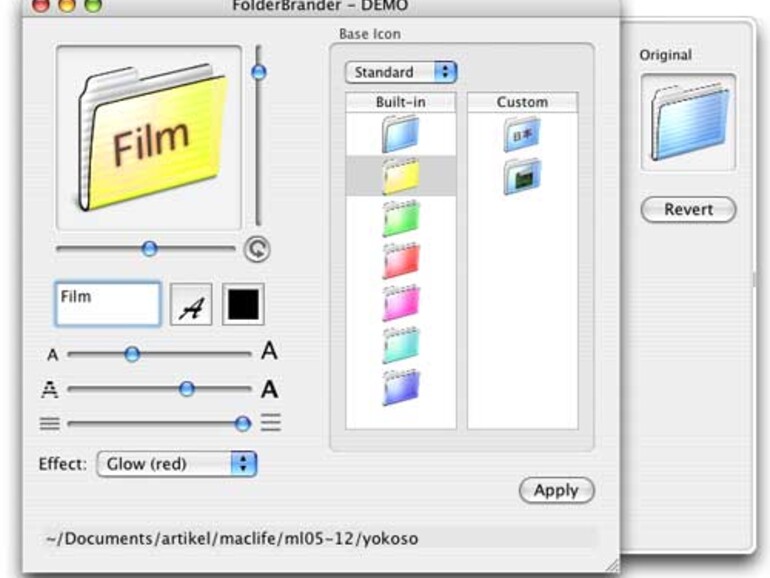 Das Branding bezieht sich auf die Möglichkeit, den Ordner mit Text zu versehen. Dieser ist in Größe, Schriftart, Farbe, Position, Transparenz und Winkel frei definierbar und sorgt so erst für die Unterscheidung von den Standardordnern. Damit sich der Text besser vom Symbol abhebt, kann ein Effekt angewandt werden: Entweder ein Schatten oder ein leichtes Glühen. Mit „Apply“ werden die Änderungen angewandt. Das Originalsymbol kann hinterher jederzeit wieder hergestellt werden.