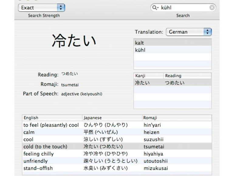 Jisho arbeitet schnell und ist über das Dienste-Menü in jeder Anwendung verfügbar. Es gibt aber keine Möglichkeit, Suchergebnisse zu sammeln und abzuspeichern. Außerdem wäre eine Live-Suche sinnvoll, die schon während der Eingabe sucht.