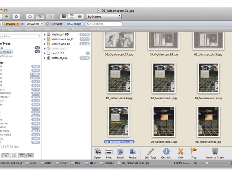 Die Suchfunktion lässt sich mit Filtern wie dem Dateityp, -datum und der Markierung kombinieren, um Suchen mit Bedingungen wie „Alle PDF-Texte aus dem Jahr 2007 mit dem Stichwort Elefant“ auszuführen. Den unvermeidlichen Inspektor bietet auch diese Shareware. Er entspricht im Prinzip der Info-Funktion vom Finder (welche auch aus dem Programm heraus erreichbar ist), ist aber besser auf Stichwörter vorbereitet – im Finder würden sie mit einem vorangestellten „&“-Zeichen erscheinen. Verzichten müssen Leap-Anwender auf die CoverFlow-Ansicht, die Anwendung bietet dafür drei Listenstile zur Auswahl.