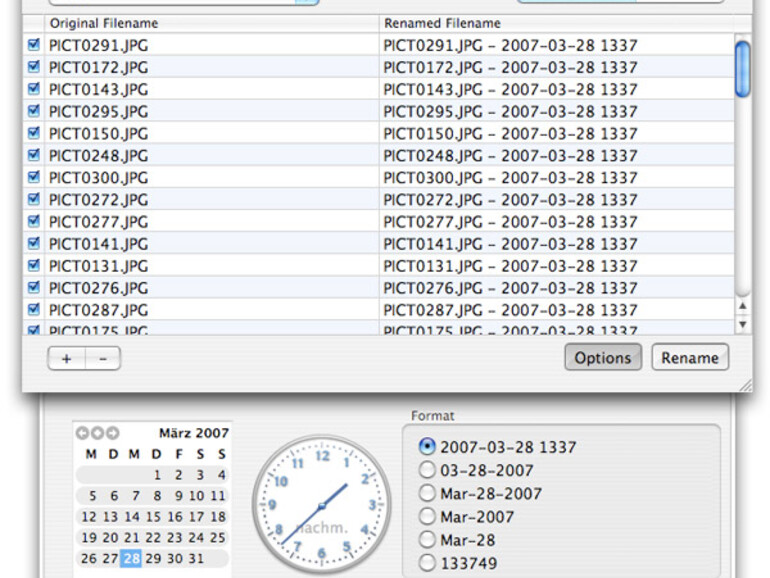 Eine wichtige Option ist die zum Verstecken der Erweiterung, denn sonst entstehen Dateinamen wie „Baum.JPG-2007-03-01“. Mit den Funktionen „Append“ und „Prepend“ werden Zeichen an den Dateinamen angehängt, beziehungsweise diesem vorangestellt. „Sequence“ nummeriert und ersetzt optional auch den ganzen Dateinamen und die letzte Methode, „Date“, fügt ein wählbares Datum ein.