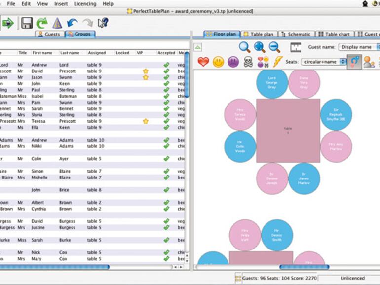 Bei der Planung der Sitzplätze hilft PerfectTablePlan, eine Software, die speziell für größere Veranstaltungen konzipiert ist. Das Programm bietet verschiedene Tischarten an, an die dann die Besucher gesetzt werden. Die Verteilung ist dabei nach verschiedenen Kriterien (Partner, Geschlecht, Abneigungen/Vorlieben) möglich, hinterher ist das Umsetzen noch möglich. Der Gastgeber sollte allerdings schon möglichst genau über seine Gäste Bescheid wissen, in einer Tabelle kann dann eingestellt werden, welche Gäste sich mögen oder nicht ausstehen können.