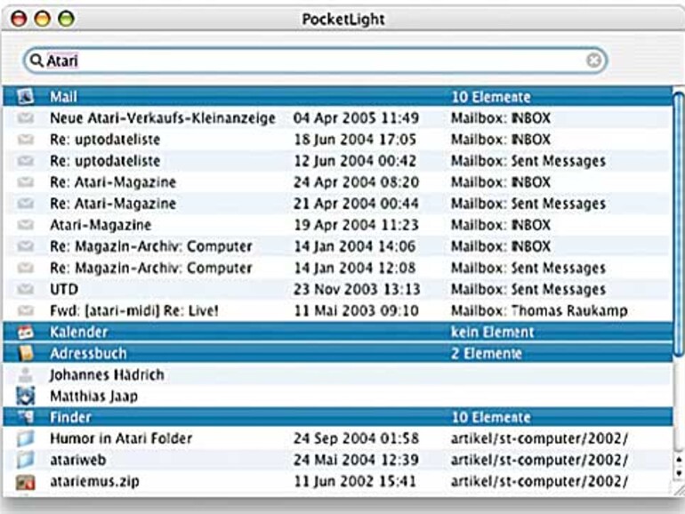 Bevor Apple den Tiger auf unschuldige Mac-Besitzer loslässt, kommt von dem kleinen Programmiererkollektiv freeridecoding ein Suchprogramm, welches optisch an Spotlight erinnert, aber unter OS X 10.3 läuft. PocketLight durchsucht Dateinamen, E-Mails, den Kalender und das Adressbuch nach Suchbegriffen. Die Suche in Dateinamen ist in den Voreinstellungen deaktiviert und nimmt auch etwas mehr Zeit in Anspruch, als die Suche nach E-Mails. Zu jedem gefundenen Ergebnis werden der Titel sowie das Datum eingeblendet, in der dritten Spalte erscheint der Mailbox-Name (E-Mail), die Telefonnummer (Adressbuch), Kalendername oder das Verzeichnis. Ein Doppelklick bewirkt die Anzeige des Suchergebnisses im jeweiligen Programm. Die Weiterentwicklung von Pocket-