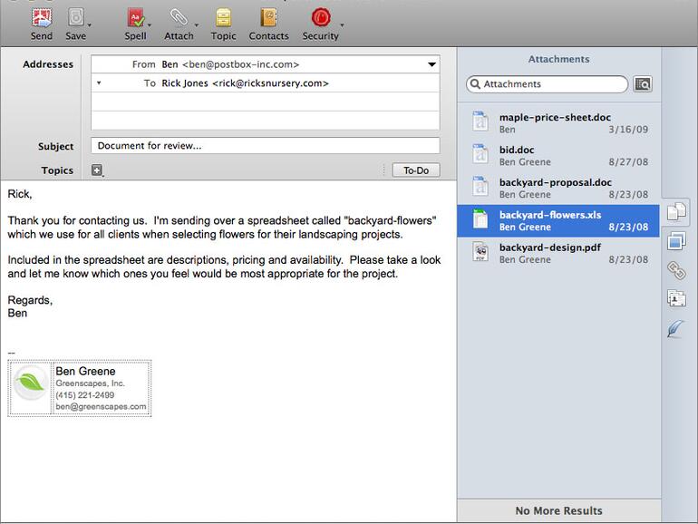 Jeder E-Mail lässt sich ein Thema zuweisen, durch das sie auch dann auffindbar bleibt, wenn ein bestimmtes Schlüsselwort nicht in ihr vorkommt. Es sind auch zwei oder noch mehr Themen möglich, für die „Lieblingsthemen“ hat Postbox spezielle Ordner, die ausschließlich E-Mails zu dem entsprechenden Thema anzeigen. Eine Art intelligentes Postfach ist die gesicherte Suche, die sich anhand bestimmter Regeln selbst füllt. Ohne weitere Unterstützung analysiert das Programm die Mails, die es anzeigt: In einem abgesetzten Bereich neben dem Nachrichtentext zeigt es Verweise, Adressen und Grafiken an.