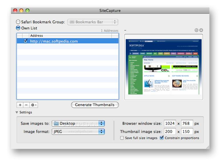 In der Standardeinstellung werden lediglich in der Größe frei definierbare Miniaturen gesichert. Da die Anwendung beim Fotografieren als „unsichtbarer“ Webbrowser agiert und die Fenstergröße Einfluss auf die Formatierung der Seitenelemente hat, ist auch die Eingabe der Fenstergröße vorgesehen. Praktischer Nebeneffekt ist, dass allen fotografierten Websites dieselbe Fenstergröße zugrunde liegt. Zusätzlich zu den Miniaturen kann SiteCapture auch die Webseiten in voller Größe sichern. Beim Bildformat besteht die Wahl zwischen BMP, TIFF, GIF, PNG und JPEG.