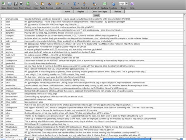 Je nach Spiel wurde ein anderer Bildschirm angezeigt, beispielsweise die DOS-Kommandozeile oder eine Tabellenkalkulations-Imitation. Lange Einleitung, einfache Anwendung: Spreadtweet ist quasi ein ständig gedrückter Boss Key, sieht aus wie Excel (OS X, Office 2004, Office 2007), ist aber in Wirklichkeit ein Twitter-Client. Die Werkzeugleiste ist daher wirkungslos, lediglich die kleinere Leiste darunter kann angeklickt werden. Statt Tabellen gibt es natürlich Tweets, von der ungewöhnlichen Darstellungsform abgesehen, wird das Übliche geboten: Die Liste lässt sich auf Antworten und direkte Nachrichten einschränken, ein Zeichenzähler existiert natürlich auch. Spreadtweet ist eine AIR-Applikation und installiert daher, sofern nicht vorhanden, die AIR-Runtime von Adobe.