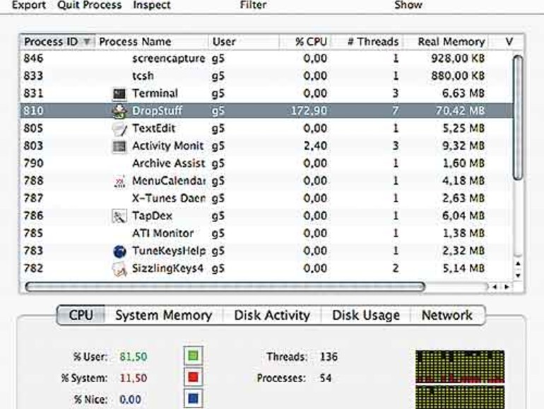 DropStuff in der Version 9.0.1 braucht deutlich länger als das Zip-Verfahren des Tigers und packt den Bilderordner zu einer Datei von 103,4 MB Größe, was eine Packrate von 4,4 Prozent entspricht und somit ein wenig schlechter als das im Betriebssystem mitgelieferte Packverfahren ist. Allerdings erreicht DropStuff beim Packen des Texte-Ordners eine deutlich bessere Leistung und erzeugt eine 1,7 MB große Datei, was einer Packrate von 74,2 Prozent entspricht.