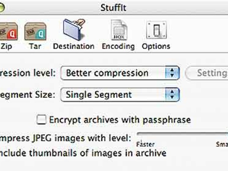 Allume Systems hat in DropStuff zehn neue Algorithmen zur JPEG-Kompression eingebaut. Bilder im JPEG-Format sind bereits komprimiert, was die relativ geringe Packrate im Zip-Verfahren und auch unter DropStuff 9 erklärt. Tatsächlich haben Allumes Algorithmen eine große Wirkung auf unseren Bilderordner: Auf beeindruckende 83 MB schrumpft das gepackte Verzeichnis, was einer Packrate von 23,2 Prozent entspricht. Die JPEG-Kompression kann im Einstellungsdialog von DropStuff sowohl deaktiviert als auch den eigenen Wünschen hinsichtlich Kompressionsqualität und Geschwindigkeit angepasst werden. Allerdings dauert das Packen bei eingeschalteter und auf geringe Größe eingestellter JPEG-Kompression deutlich länger. Schaltet man diese aus, arbeitet die Zehnerversion etwas schneller als der Vorgänger. Leicht enttäuschend ist das Resultat des Packprozesses unseres Texte-Ordners, denn die Größe der gepackten Datei entspricht auf das Byte genau dem entsprechenden Archiv der Vorgängerversion.