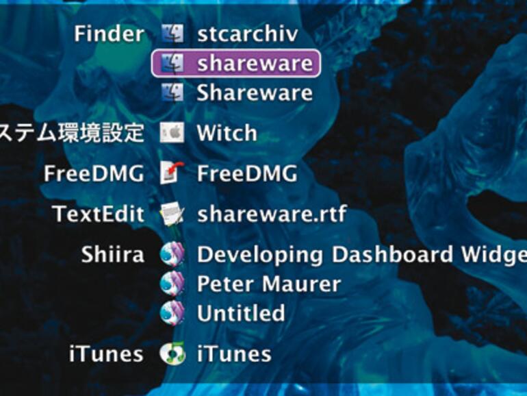 Exposé ist optisch sehr gelungen, aber bei vielen offenen Fenstern wird es unübersichtlich, und über Apfel+Tab ist nur ein Wechsel zwischen einzelnen Anwendungen möglich. Mit Witch ist dies anders: Per Tastendruck kann jedes einzelne Fenster angewählt werden, ganz gleich, ob es offen oder minimiert ist. Nach der Installation eines neuen Kontrollfelds und einem Klick auf Aktivieren ist Witch einsatzbereit. Mit Alt+Tab erscheint dann das transparente Übersichtsfenster, in dem die Anwendungen sortiert nach Namen, Fenstertitel oder Programmaktivität aufgelistet werden.