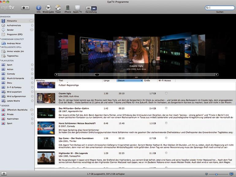 Die automatische Exportfunktion lässt sich auch deaktivieren, um sie über die Listenansicht im Programmfenster nur auf ausgewählte Aufnahmen anzuwenden. Wir testeten den drahtlosen Zugriff mit einem iPod touch, was problemlos klappte. Zudem kann der Zugriff nun auch mit einem Passwort geschützt werden. Neben einer verbesserten Wifi-Access-Funktion bietet EyeTV 3 die Möglichkeit, Bibliotheken für andere Computer in einem lokalen Netzwerk freizugeben, wobei man natürlich auch hier sofort an das große Apple-Programm mit dem blauen Notensymbol denken muss.