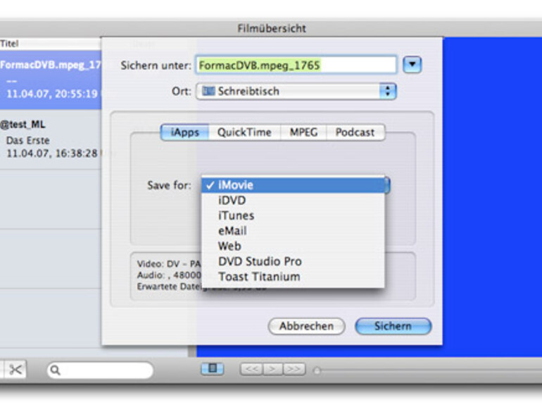 Aufnahmen macht Formac im gebräuchlichen MPEG-Format. Sie lassen sich direkt in der Software bearbeiten und sind in diversen Formaten exportierbar – jetzt auch für i-Apps und komprimiert für E-Mail, Web und den iPod. Die Aufnahmen lassen sich per Knopfdruck und manuellem Timer starten oder direkt aus der von den Sendern mitgelieferten EPG-Programmübersicht auswählen. Charmant: Zum Aufnehmen fährt die Software den Mac auch hoch – wenn er nicht passwortgeschützt ist.