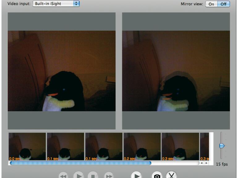 FrameByFrame ist dann am sinnvollsten, wenn ein Livebild der Kamera betrachtet werden kann. Das klappt nicht mit jeder Kamera, einigen kann mit den Treibern des macam-Projekts zur Kompatibilität verholfen werden. Notfalls begnügt sich das Programm auch mit der eingebauten iSight – eine externe Kamera auf einem Stativ bietet aber mehr Flexibilität.