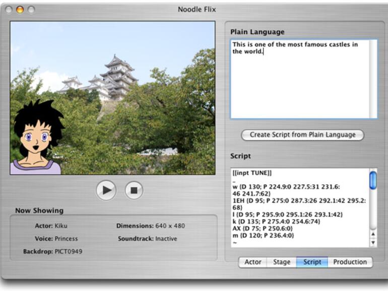 Der Hintergrund ist frei wählbar, die Figur kann eine von drei Positionen einnehmen. Per Skalierung wird die Computerfigur zum Figürchen degradiert. Die Wahl eines Films als Hintergrund erlaubt die Software nicht, Final-Cut-Besitzer wählen in Noodle Flix einen grünen oder blauen Hintergrund und ersetzen diesen dann in der Schnittsoftware. Die Texteingabe erfolgt unter „Script“, wer sich auf die Apple-eigenen Stimmen beschränkt, muss damit leben, dass alles andere als Englisch sich etwas seltsam anhört. Der eingegebene Text wird von der Software in ein passendes Skriptformat konvertiert.
