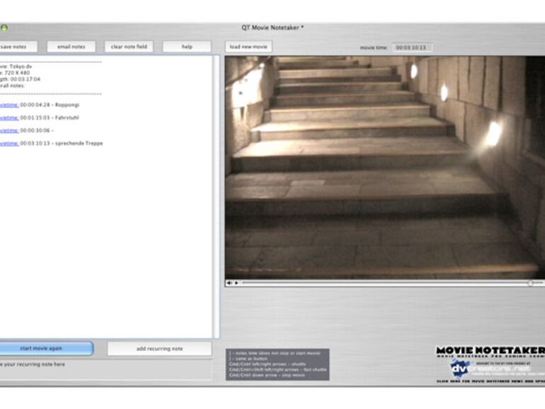 Beim analogen Schnitt war es noch unverzichtbar, sich die zeitliche Position jeder einzelnen Szene zu notieren, um lästiges hin- und herspulen zu vermeiden. Doch auch wenn es schneller geht, ist das Suchen einer bestimmten Stelle in Videodateien nicht viel angenehmer. QT Movie NoteTaker kombiniert einen Notizzettel mit einem Videowiedergabeprogramm, geschrieben wird nicht in die Videodatei, sondern in eine gewöhnliche Textdatei. Jede Notiz, die mit einem Klick auf „Add recurring note“ eingeleitet wird, stellt der NoteTaker mit einer Zeitangabe dar. Ein Klick auf „movietime“ in der nicht sortierten Liste führt zur entsprechenden Stelle im Film – wer nicht gerade sehr aussagekräftige Beschreibungen notiert, wird diese Funktion häufiger benutzen, da die Software kein Vorschaubild oder ähnliches im Notizfeld ablegt.