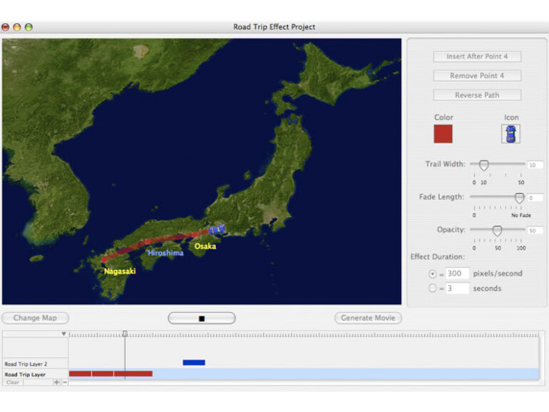 Als Einleitung für Reisefilme eignen sie sich perfekt: Landkarten, die gleichzeitig noch die Route zeigen und den Zuschauern so ein ungefähres Gefühl der Entfernungen geben. RoadTrip Effect generiert solche animierten Reiserouten und liefert eine Reihe von Karten gleich mit – es kann aber auch eine beliebige andere Grafik als Hintergrund dienen. Die einzelnen Routenpunkte werden per Mausklick gesetzt und von 2D-Objekten (Flugzeug, Auto, Schiff, Zug) abgefahren. Da die Software nur gerade Linien kennt, wirkt das zwangsläufig sehr statisch. Gut gemacht ist hingegen der Schweif, den jedes Fahrzeug hinter sich lässt. Die Reisepunkte müssen nicht anonym bleiben, ein Text erleichtert die Identifizierung.