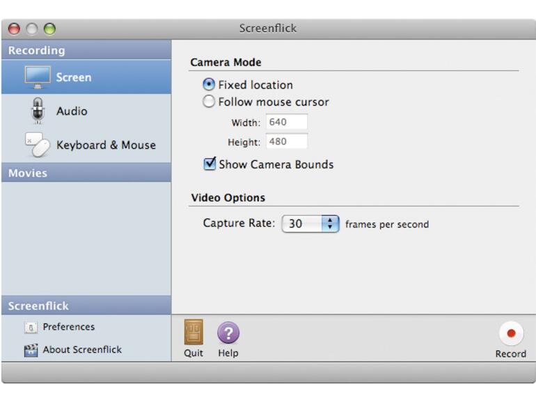 Vorher unter dem Namen „Screencast“ bekannt, sorgt die Anwendung nun als Screenflick für Trainingsvideos. Nach dem ersten Start erwartet den Videofilmer ohne Kamera ein übersichtlich aufgebautes Hauptfenster, welches alle Funktionen des Programms enthält – Ausflüge in die Menüleiste sind unnötig. Screenflick kennt zwei Aufnahmemodi, zwischen denen während der laufenden Aufnahme nicht umgeschaltet werden kann: fester Bereich und Mauszeigerverfolgung.