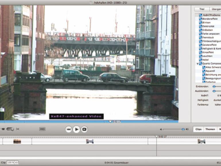 Der Schritt zum Bewegtbild wird nun unter iMovie gewagt, und da Xe847 als Universal Binary vorliegt, läuft es auch gut auf Macs mit Intel-CPU. Der Hersteller stapelt durchaus tief und garantiert nur, dass sich der Gesamteindruck verbessert. Zwar führt Xe847 eine ganze Reihe von Optimierungstechniken aus, um beispielsweise Farbstiche zu eliminieren, die Schärfe zu erhöhen oder die Farbtöne aufzupolieren, aber das Ergebnis hängt stark von der Kamera und den Aufnahmen ab. Die Testaufnahmen wurden mit einer einfachen NTSC-DV-Kamera gemacht – viel Arbeit also für die Farbpolitur. In der Pro-Version des Plug-ins können die Stärke des Effekts sowie Helligkeit und Farbtemperatur eingestellt werden. Die Basisversion muss ohne diese Einstellungen auskommen, am eigentlichen Algorithmus ändert dies nichts.