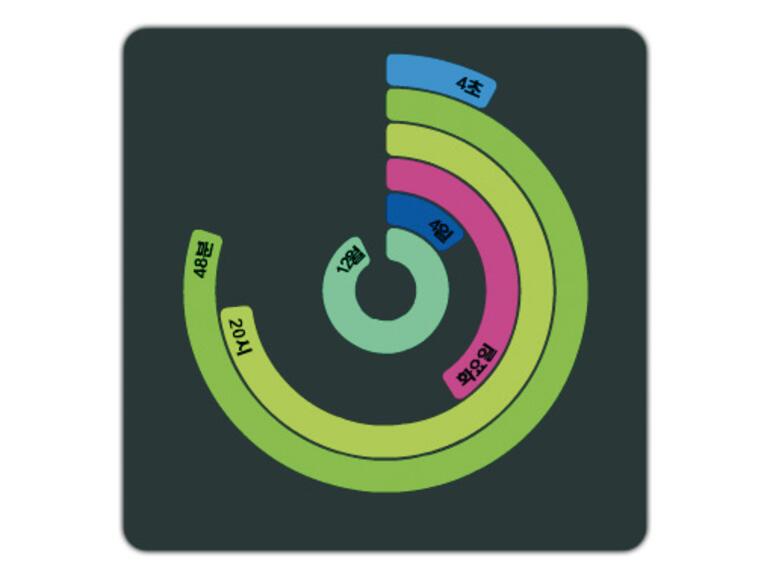 Jede Zeiteinheit (Sekunden, Minuten, Stunden, Tag, Monat) hat einen eigenen Balken, beim Weiterzählen verlängern diese sich entsprechend. Zusätzlich variiert das Widget die Farben. Kleine Besonderheit: Auf der Rückseite kann zwischen mehr als zwölf Sprachen gewählt werden.