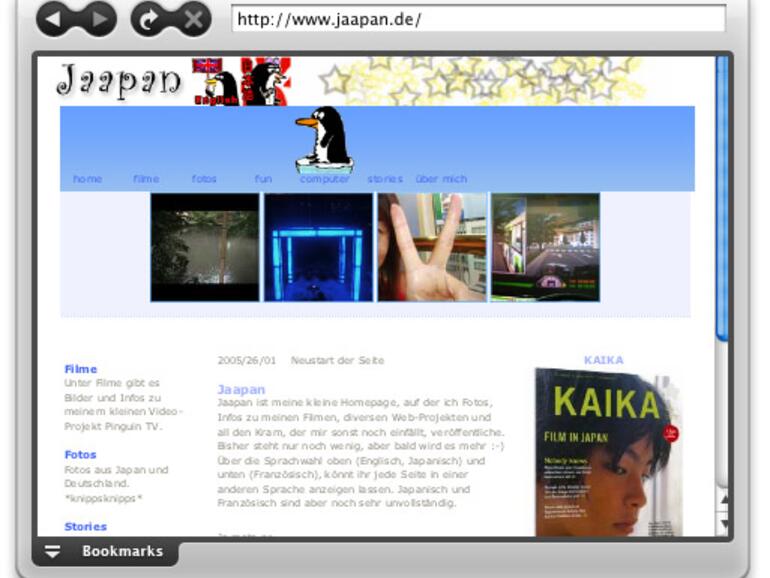 Als Basis dient die Safari-Alternative Shiira und die Miniausgabe unterstützt zusätzlich auch Safari-Lesezeichen. Eine Installation von Shiira ist jedoch keine Voraussetzung. Der Mini-Browser schrumpft jede Webseite ein, was in den meisten Fällen erstaunlich gut gelingt. Möchte man doch einmal die Webseite in Originalgröße betrachten, genügt ein Klick auf das Symbol neben den Lesezeichen, um die Seite in einem normalen Webbrowser aufzurufen. Die sonstigen Bedienelemente beschränken sich auf das Nötigste: Vor/Zurück, Neu laden und abbrechen. Die Rückseite des Widgets erlaubt das Ändern der Farbgebung, sowie die Eingabe der Startseite.