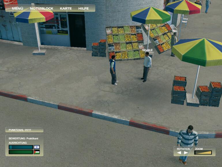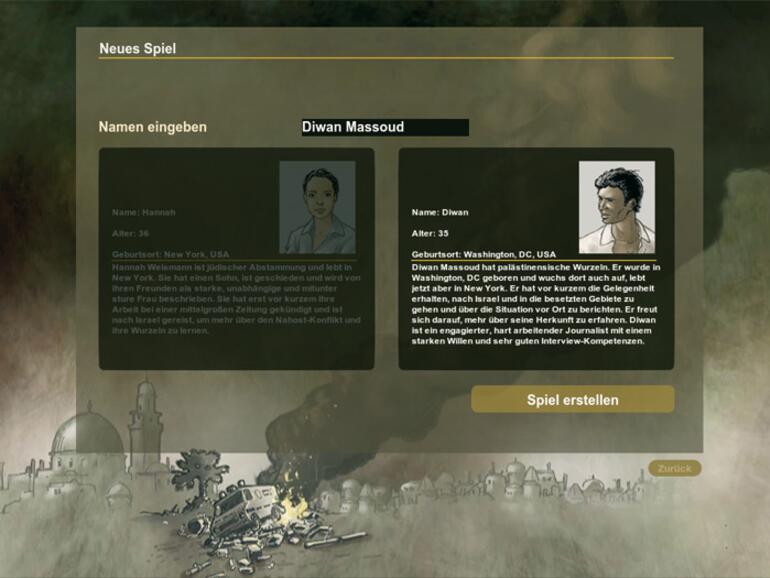 Nun folgt die Recherche. Hierbei laufen Sie in einer mehr oder weniger detaillierten 3D-Landschaft von einem Informanten zum nächsten. So redet man beispielsweise mit Hamas-Aktivisten wie auch mit israelischen Soldaten, Diplomaten und Mitarbeitern von Hilfsorganisationen. Die Gespräche laufen nach dem in Adventures bewährten Multiple-Choice-Verfahren ab. Je nach „Gesinnung“ der vom Spieler gestellten Fragen werden die gegebenen Antworten und somit der weitere Missionsverlauf beeinflusst.