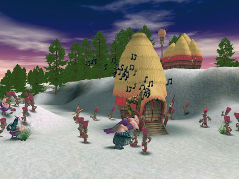 Wenn Häuptling Furzhose mit seinem „Grässlichen Gedudel“ Feinde betäubt, der Anführer der Eingeborenen die „Wummernde Wolke“ beschwört und knollennasigen Wikingerkriegern einen „Ekligen Eintopf“ köchelt, merkt man schon, dass es in Tribal Trouble nicht ganz ernst zugeht. Das spiegelt sich auch am Grafikstil wieder, der einen Comic-haften Charakter aufweist, mit seinem kantigen Charme jedoch in eher prähistorischen Technikdimensionen angesiedelt ist. Das wiederum passt zur Geschichte des Spiels, die von einem Wikingerstamm erzählt, der auszog, um malerische Inseln nach Reichtümern zu durchsuchen. Klar, dass die dort lebenden Eingeborenen etwas gegen diese Schnüffler haben und sie mit gezückten Speeren erwarten.