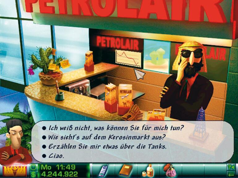 Bei all der spielerischen Tiefe und Ernsthaftigkeit ist Airline Tycoon aber keine staubtrockene Wirtschaftssimulation. Die Macher von Spellbound haben viele witzige Kleinigkeiten eingebaut, die dem Spiel einen erfrischenden, augenzwinkernden Humor verpassen. So gibt es einige wirklich aberwitzige Optionen, wie etwa die Möglichkeit, die Flugzeuge der Konkurrenz mittels Sabotage lahm zu legen, das Bordessen zu versalzen oder den anderen Managern heimlich Abführmittel unterzujubeln, damit diese vor lauter Durchfall nicht arbeiten können. Auch der Flughafen Atlantis dürfte im realen Flugbetrieb nicht allzu häufig angeflogen werden. Etwas gewöhnungsbedürftig ist allerdings der Einstieg, denn die Bedienung erfolgt ohne direkt erkennbare Schaltflächen oder Menüs und ohne die zentrale Managementschaltstelle muss man an jedem Handlungsort alle Optionen erstmal ausloten, was etwas Eingewöhnung bedarf.