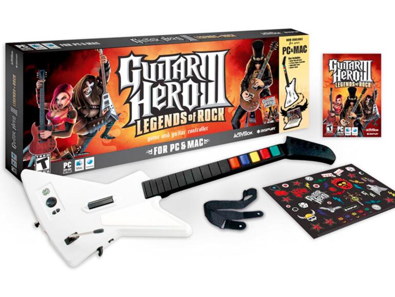 Der große Guitar-Hero-Karton enthält eine Spiele-DVD (die sich zum Spielen im Laufwerk befinden muss), eine deutschsprachige Anleitung, den Gitarren-Controller mit Gurt und einen Satz an Aufklebern. Das Spiel nimmt nach der Installation rund sechs Gigabyte auf der Festplatte in Beschlag, ein freier USB-Port wird für den Anschluss der Gitarre benötigt. Treiber müssen nicht installiert werden.