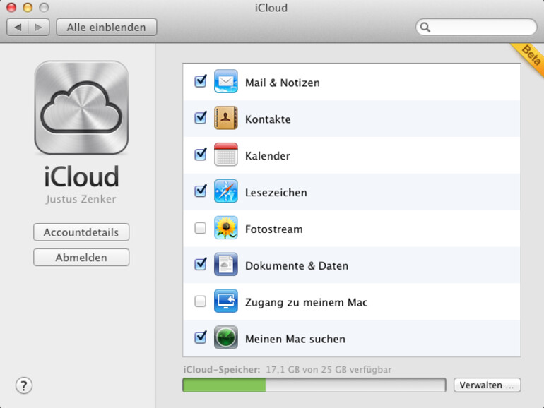 Verwenden Sie eine eigene E-Mail-Adressse, werden Mails und Notizen nicht synchronisiert. Lassen Sie sich nicht von den deaktivierten Funktionen Fotostream und Zugang zu meinem Mac irritieren. Beide Dienste können im Anschluss eingeschalten werden. Voraussetzung für Foto Stream ist jedoch iPhoto '11 in der Version 9.2
