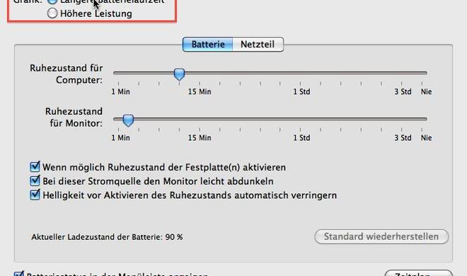 Akku Laufzeit optimieren„Turbo-Modus“ beim MacBook Pro 15“ abschalten Bekanntlich verfügen einige MacBooks Pro 15“ und 17“, beispielsweise das mit 2,66 GHz aus dem Sommer 2009, neben der normalen Grafikkarte NVIDIA GeForce 9400M...