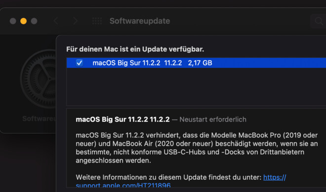 Desktop-BetriebssystemmacOS Big Sur 11.2.2 soll Beschädigungen verhindern Apple hat mit macOS Big Sur 11.2.2 ein Update für das neue Betriebssystem veröffentlicht, mit dem Beschädigungen an Macs verhindert werden sollen.