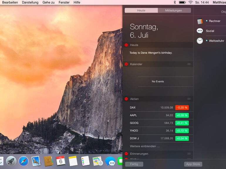 Die augenfälligsten Neuerungen finden sich in der Mitteilungszentrale. Hier laufen Mitteilungen ein und werden persönlich relevante Informationen angezeigt. Optisch nähert sich das Mac-System sehr an iOS an. Es gibt die Ansicht für den heutigen Tag. Damit sieht die Mac-Nachrichtenzentrale nun aus wie auf dem iPad unter iOS 7. Bei den Funktionen zieht die Nachrichtenzentrale auf dem Mac mit iOS 8 gleich. Denn über das Konzept der Erweiterungen lassen sich eigene Elemente im Menü am rechten Bildschirmrand des Macintosh unterbringen. Viele Entwickler dürften jetzt prüfen, wie sie ihre Apps dort platzieren können. Zusätzlich wird es neue Apps nur für die Mitteilungszentrale geben, die man sich im App Store wird laden können.
