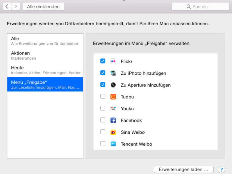 Dank der Erweiterungen kann zum Beispiel auch das Teilen-Menü in allen Apps auf dem Mac individuell angepasst werden. Facebook und Twitter werden sich gezielt ausschalten lassen, wenn man nur E-Mail und Flickr nutzt, um im eigenen Freundeskreis zu kommunizieren. Zudem werden andere Netzwerke wie Pinterest und Path als neue Angebote dort einziehen können.
