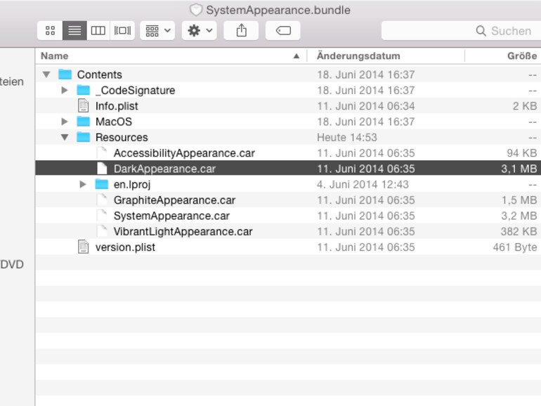 OS X Yosemite wird eine neue Ansicht für alle Fenster und Menüs mitbringen. Als „DarkAppearance“ befindet sich das dunkle Thema bereits in der Beta-Version, ist jedoch noch unfertig. Im dunklen Thema invertiert das System die Darstellung. Menüs zeigen dann weiße Schrift auf einem grau-schwarzem Fond.