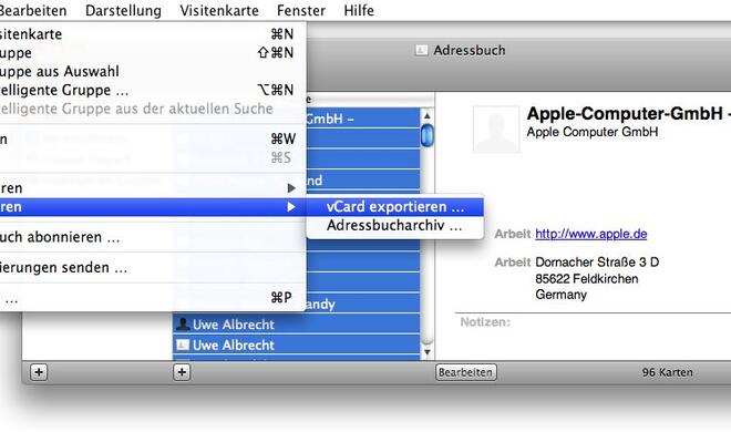 Gruppen-vCardMehrere Adressen aus dem Adressbuch exportieren Mehrere Adressen aus dem Adressbuch von Mac OS X 10.5 lassen sich problemlos als Gruppen-vCard exportieren. Wählen Sie zunächst alle gewünschten Adressen aus.