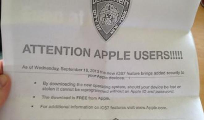 Bitte benutzen!Aktivierungssperre: Polizei in New York wirbt via Flugblatt für iOS 7 „ACHTUNG, APPLE-ANWENDER!!!!!“, schreien die massenkopierten Zettel mit Polizei-Insignien den Passanten derzeit an New Yorker U-Bahn-Stationen aus den Händen von...